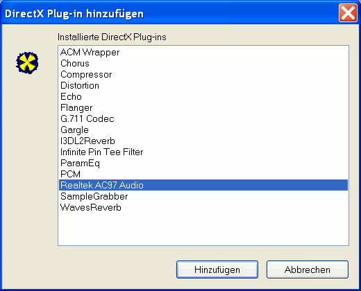 Klicken Sie jetzt auf 'Hinzufügen'. Damit wird eine Liste aller auf Ihrem System installierten Plug-Ins angezeigt. Wählen Sie nun das Plug-In, welches Sie in Raduga verwenden möchten und klicken Sie dann auf 'Hinzufügen'.