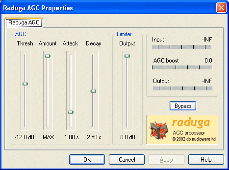 Um die Einstellung eines Plug-Ins anzupassen, starten Sie einen neuen Titel, dann wählen Sie das Plug-In aus und klicken auf 'Eigenschaften'. Dadurch wird eine Seite mit den spezifischen Einstellungen des gewählten Plug-Ins angezeigt. Die untere Abbildung zeigt die Einstellungen des Raduga AGC DirectX Plug-Ins.