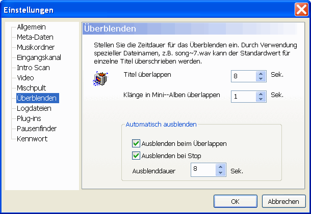 Ausblenden beim Überlappen - Wenn Sie z.B. globales Überlappen auf 7 Sekunden eingestellt haben, beginnt